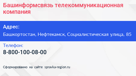 Башинформсвязь, телекоммуникационная компания по адресу Башкортостан, Нефтекамск, Социалистическая улица, 85 в дальнейшем Организация, размещена в следующих категориях: