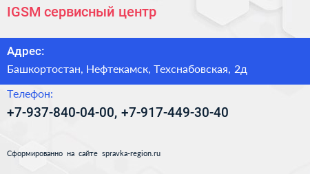 IGSM, сервисный центр по адресу Башкортостан, Нефтекамск, Техснабовская, 2д в дальнейшем Организация, размещена в следующих категориях: