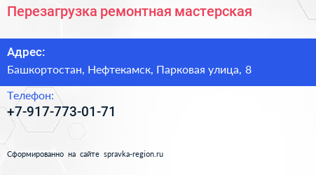 Перезагрузка, ремонтная мастерская по адресу Башкортостан, Нефтекамск, Парковая улица, 8 в дальнейшем Организация, размещена в следующих категориях: