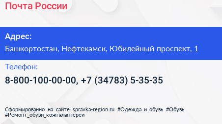 Почта России по адресу Башкортостан, Нефтекамск, Юбилейный проспект, 1 в дальнейшем Организация, размещена в следующих категориях:
