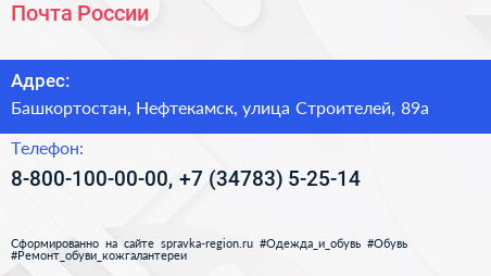 Почта России по адресу Башкортостан, Нефтекамск, улица Строителей, 89а в дальнейшем Организация, размещена в следующих категориях: