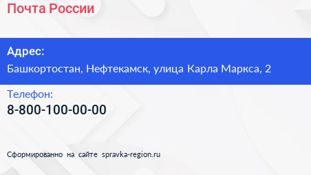 Почта России по адресу Башкортостан, Нефтекамск, улица Карла Маркса, 2 в дальнейшем Организация, размещена в следующих категориях: