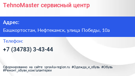 TehnoMaster, сервисный центр по адресу Башкортостан, Нефтекамск, улица Победы, 10а в дальнейшем Организация, размещена в следующих категориях: