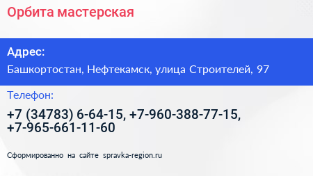 Орбита, мастерская по адресу Башкортостан, Нефтекамск, улица Строителей, 97 в дальнейшем Организация, размещена в следующих категориях: