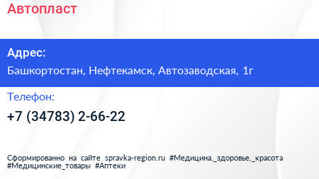 Автопласт по адресу Башкортостан, Нефтекамск, Автозаводская, 1г в дальнейшем Организация, размещена в следующих категориях:
