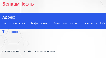 БелкамНефть по адресу Башкортостан, Нефтекамск, Комсомольский проспект, 19а в дальнейшем Организация, размещена в следующих категориях: