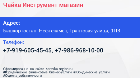 Чайка Инструмент, магазин по адресу Башкортостан, Нефтекамск, Трактовая улица, 1ПЗ в дальнейшем Организация, размещена в следующих категориях: