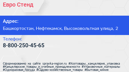 Евро Стенд по адресу Башкортостан, Нефтекамск, Высоковольтная улица, 2 в дальнейшем Организация, размещена в следующих категориях: