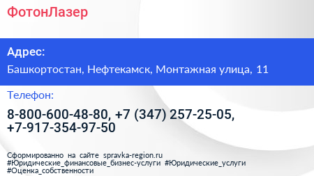 ФотонЛазер по адресу Башкортостан, Нефтекамск, Монтажная улица, 11 в дальнейшем Организация, размещена в следующих категориях: