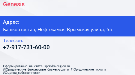 Genesis по адресу Башкортостан, Нефтекамск, Крымская улица, 55 в дальнейшем Организация, размещена в следующих категориях: