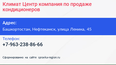 Климат Центр, компания по продаже кондиционеров по адресу Башкортостан, Нефтекамск, улица Ленина, 45 в дальнейшем Организация, размещена в следующих категориях: