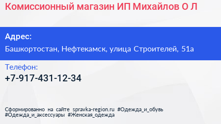 Комиссионный магазин, ИП Михайлов О.Л. по адресу Башкортостан, Нефтекамск, улица Строителей, 51а в дальнейшем Организация, размещена в следующих категориях: