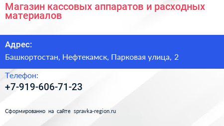 Магазин кассовых аппаратов и расходных материалов по адресу Башкортостан, Нефтекамск, Парковая улица, 2 в дальнейшем Организация, размещена в следующих категориях: