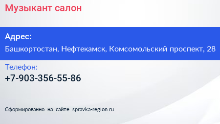 Музыкант, салон по адресу Башкортостан, Нефтекамск, Комсомольский проспект, 28 в дальнейшем Организация, размещена в следующих категориях: