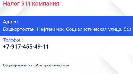 Налог 911, компания по адресу Башкортостан, Нефтекамск, Социалистическая улица, 56а в дальнейшем Организация, размещена в следующих категориях: