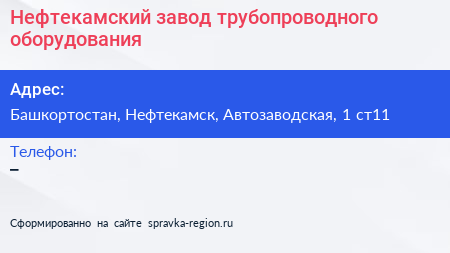 Нефтекамский завод трубопроводного оборудования по адресу Башкортостан, Нефтекамск, Автозаводская, 1 ст11 в дальнейшем Организация, размещена в следующих категориях: