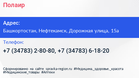 Полаир по адресу Башкортостан, Нефтекамск, Дорожная улица, 15а в дальнейшем Организация, размещена в следующих категориях:
