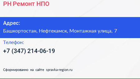 РН-Ремонт НПО по адресу Башкортостан, Нефтекамск, Монтажная улица, 7 в дальнейшем Организация, размещена в следующих категориях: