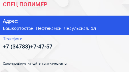 СПЕЦ-ПОЛИМЕР по адресу Башкортостан, Нефтекамск, Янаульская, 1л в дальнейшем Организация, размещена в следующих категориях: