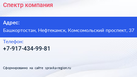 Спектр, компания по адресу Башкортостан, Нефтекамск, Комсомольский проспект, 37 в дальнейшем Организация, размещена в следующих категориях:
