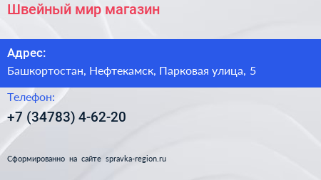 Швейный мир, магазин по адресу Башкортостан, Нефтекамск, Парковая улица, 5 в дальнейшем Организация, размещена в следующих категориях: