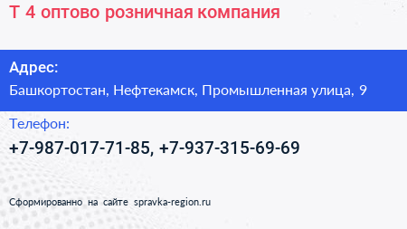 Т-4, оптово-розничная компания по адресу Башкортостан, Нефтекамск, Промышленная улица, 9 в дальнейшем Организация, размещена в следующих категориях: