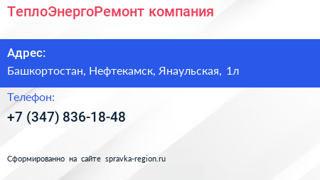ТеплоЭнергоРемонт, компания по адресу Башкортостан, Нефтекамск, Янаульская, 1л в дальнейшем Организация, размещена в следующих категориях:
