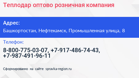 Теплодар, оптово-розничная компания по адресу Башкортостан, Нефтекамск, Промышленная улица, 8 в дальнейшем Организация, размещена в следующих категориях: