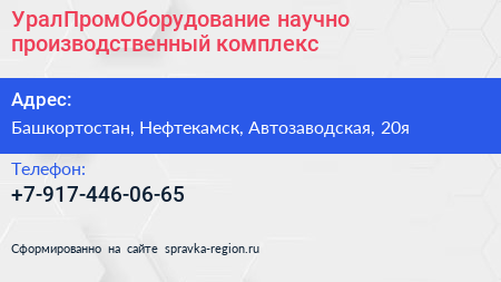 УралПромОборудование, научно-производственный комплекс по адресу Башкортостан, Нефтекамск, Автозаводская, 20я в дальнейшем Организация, размещена в следующих категориях: