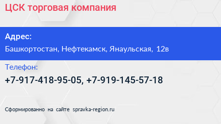 ЦСК, торговая компания по адресу Башкортостан, Нефтекамск, Янаульская, 12в в дальнейшем Организация, размещена в следующих категориях: