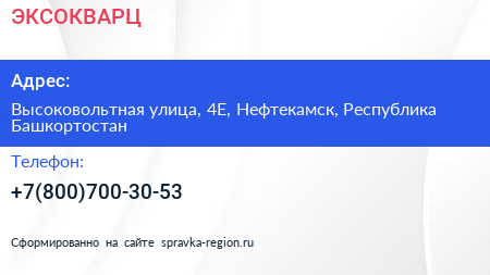 ЭКСОКВАРЦ по адресу Высоковольтная улица, 4Е, Нефтекамск, Республика Башкортостан в дальнейшем Организация, размещена в следующих категориях: