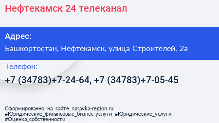 Нефтекамск 24, телеканал по адресу Башкортостан, Нефтекамск, улица Строителей, 2а в дальнейшем Организация, размещена в следующих категориях: