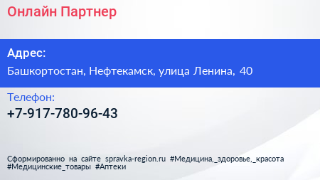 Онлайн Партнер по адресу Башкортостан, Нефтекамск, улица Ленина, 40 в дальнейшем Организация, размещена в следующих категориях: