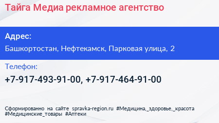 Тайга Медиа, рекламное агентство по адресу Башкортостан, Нефтекамск, Парковая улица, 2 в дальнейшем Организация, размещена в следующих категориях: