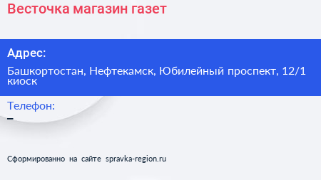Весточка, магазин газет по адресу Башкортостан, Нефтекамск, Юбилейный проспект, 12/1 киоск в дальнейшем Организация, размещена в следующих категориях: