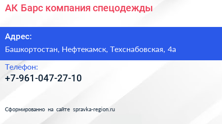 АК Барс, компания спецодежды по адресу Башкортостан, Нефтекамск, Техснабовская, 4а в дальнейшем Организация, размещена в следующих категориях: