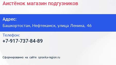 Аистёнок, магазин подгузников по адресу Башкортостан, Нефтекамск, улица Ленина, 46 в дальнейшем Организация, размещена в следующих категориях: