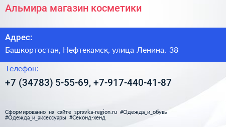 Альмира, магазин косметики по адресу Башкортостан, Нефтекамск, улица Ленина, 38 в дальнейшем Организация, размещена в следующих категориях:
