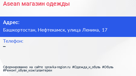Asean, магазин одежды по адресу Башкортостан, Нефтекамск, улица Ленина, 17 в дальнейшем Организация, размещена в следующих категориях: