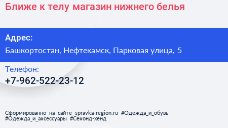 Ближе к телу, магазин нижнего белья по адресу Башкортостан, Нефтекамск, Парковая улица, 5 в дальнейшем Организация, размещена в следующих категориях: