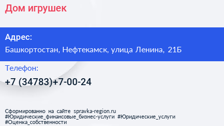 Дом игрушек по адресу Башкортостан, Нефтекамск, улица Ленина, 21Б в дальнейшем Организация, размещена в следующих категориях: