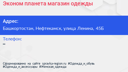 Эконом планета, магазин одежды по адресу Башкортостан, Нефтекамск, улица Ленина, 45Б в дальнейшем Организация, размещена в следующих категориях: