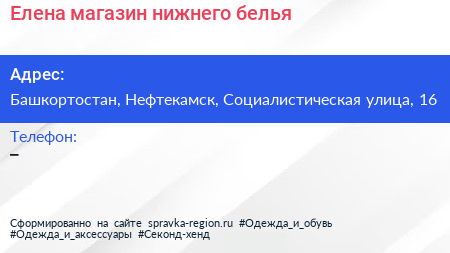 Елена, магазин нижнего белья по адресу Башкортостан, Нефтекамск, Социалистическая улица, 16 в дальнейшем Организация, размещена в следующих категориях: