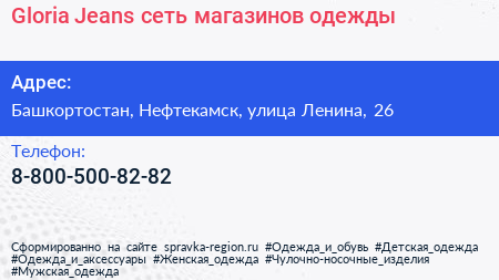 Gloria Jeans, сеть магазинов одежды по адресу Башкортостан, Нефтекамск, улица Ленина, 26 в дальнейшем Организация, размещена в следующих категориях: