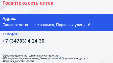 Госаптека, сеть аптек по адресу Башкортостан, Нефтекамск, Парковая улица, 6 в дальнейшем Организация, размещена в следующих категориях:
