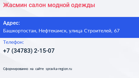 Жасмин, салон модной одежды по адресу Башкортостан, Нефтекамск, улица Строителей, 67 в дальнейшем Организация, размещена в следующих категориях: