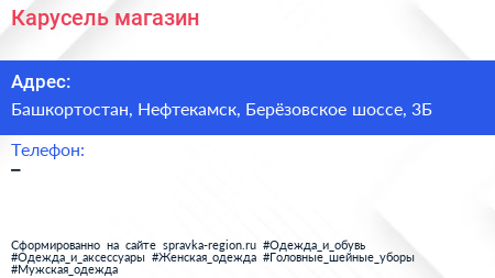 Карусель, магазин по адресу Башкортостан, Нефтекамск, Берёзовское шоссе, 3Б в дальнейшем Организация, размещена в следующих категориях: