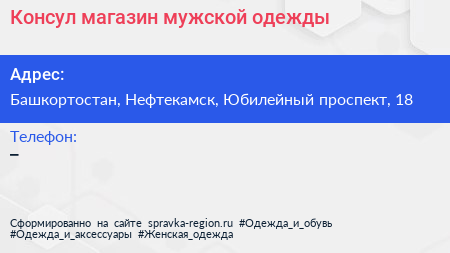 Консул, магазин мужской одежды по адресу Башкортостан, Нефтекамск, Юбилейный проспект, 18 в дальнейшем Организация, размещена в следующих категориях: