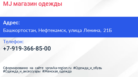 MJ, магазин одежды по адресу Башкортостан, Нефтекамск, улица Ленина, 21Б в дальнейшем Организация, размещена в следующих категориях: