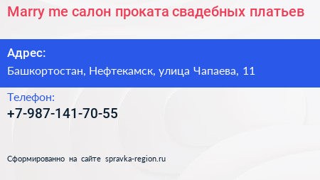 Marry me, салон проката свадебных платьев по адресу Башкортостан, Нефтекамск, улица Чапаева, 11 в дальнейшем Организация, размещена в следующих категориях:
